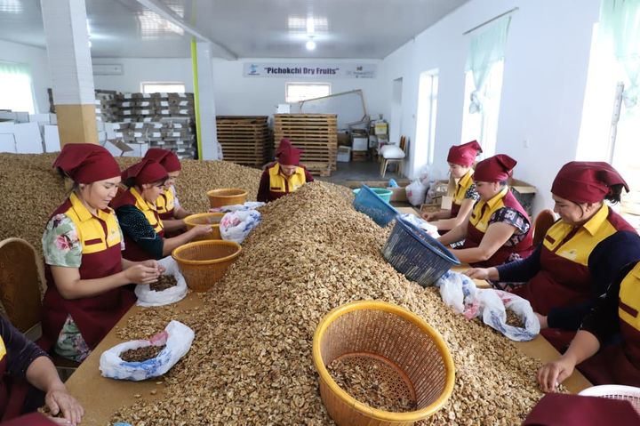 Bu yerda tumanning barcha hududlaridan kelgan xotin-qizlar va yoshlar mehnat qilyapti. Ular yong‘oq mag‘izini saralab, qadoqlaydi.