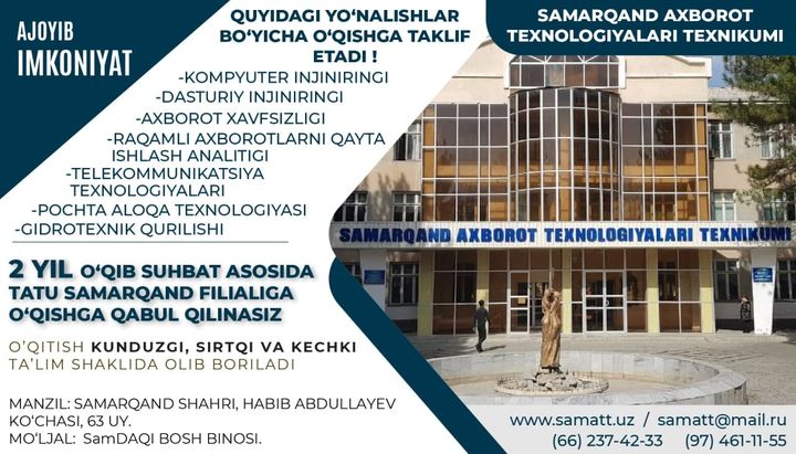 Samarqand axborot texnologiyalari texnikumi quyidagi mutaxassisliklar bo‘yicha o’qishga taklif etadi: