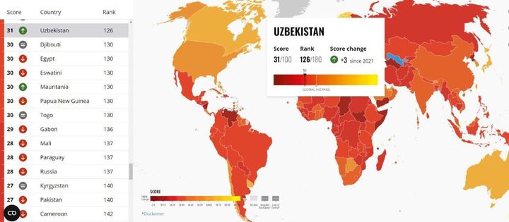 "Transparency International" xalqaro tashkilotining “Korrupsiyani qabul qilish indeksi”da O‘zbekiston 2022 yil natijalariga ko‘ra, 180 ta davlat orasida 126-o‘rinni egalladi.