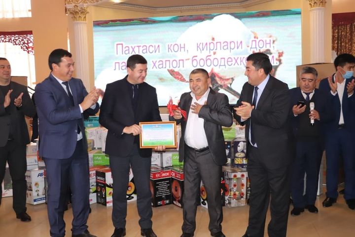 Shuningdek, terim ishlarida ilg‘orlikni qo‘ldan bermagan Maniobod mahallasida yashovchi Latofat Ergashevaga televizor va 1 million so‘m, Do‘stlarobod mahallasidan Umida Toshpo‘latovaga muzlatgich va 1 million so‘m va mavsum davomida 10 tonna paxta tergan Polvonariq mahallasida yashovchi Gulbahor Chinniqulovaga "Damas" avtomobili berildi.