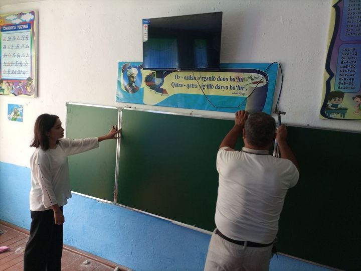Maktabda 32 ta sinfxona mavjud bo‘lib, shu kungacha 21 ta sinf xonalardagi doskalar yangisiga almashtirilgan edi.