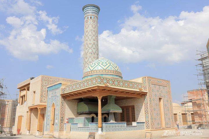 Qadimiy shaharcha pishiq g‘ishtdan bino qilinyapti. Minora balandligi 27 metr. Uni Rahmon Tohirov shogirdlari yordamida tikladi. Hozirda qurib bitkazilgan minora va gumbazga naqshli koshinlar yopishtirilmoqda. Usta Shokir Mo‘minov ham shu yerda o‘zining naqqoshlik san’atini namoyon etmoqda.