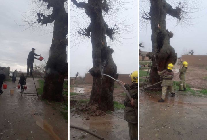 Qo‘shrabotda chaqmoq ta’sirida yonib ketgan 100 yoshdan oshgan tut daraxti saqlab qolindi