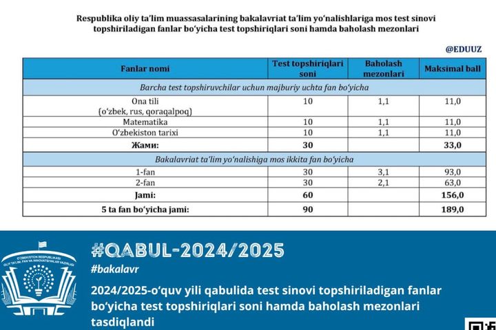Umumiy 2024/2025-o‘quv yili qabulida abituriyentlarga 5 ta fan bo‘yicha jami 90 ta test topshirig‘i beriladi. Bunda to‘plash mumkin bo‘lgan maksimal ball – 189 ballni tashkil etadi.