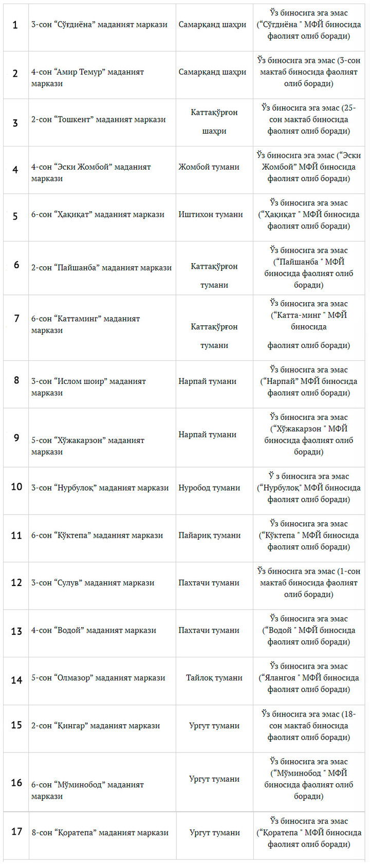 Shuningdek, hujjat bilan samarasiz faoliyat yuritayotganligi sababli 2019 yil 1 apreldan e’tiboran faoliyati tugatiladigan madaniyat markazlarining ro‘yxati tasdiqlandi.