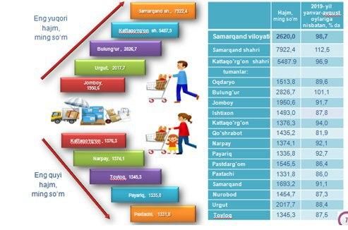 Shuningdek, ushbu ko‘rsatkich mos ravishda Past Darg‘om tumanida 13,6 foizga, Qo‘shrabotda 18,1 foizga, Paxtachida 14,0 foizga, Nurobodda 12,7 foizga, Urgutda 11,6 foizga, Toyloqda 12,5 foizga, Oqdaryoda 10,4 foizga hamda Ishtixonda 12,2 foizga 2019 yilning yanvar-avgust oylariga nisbatan pasayish kuzatilgan.
