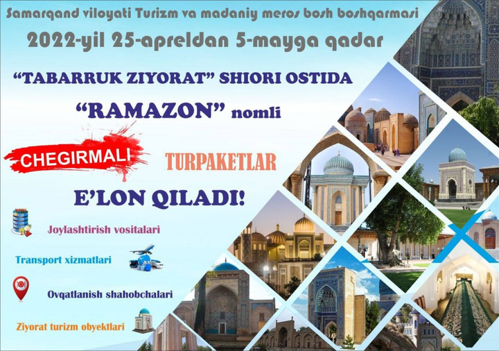 Viloyat turizm va madaniy meros bosh boshqarmasi hamda Kasaba uyushmalari federatsiyasi viloyat bo‘limi tashabbusi bilan viloyatdagi turistik firmalar tomonidan 25 apreldan 5 maygacha “Ramazon” nomli imtiyozli turistik paket e’lon qilindi.