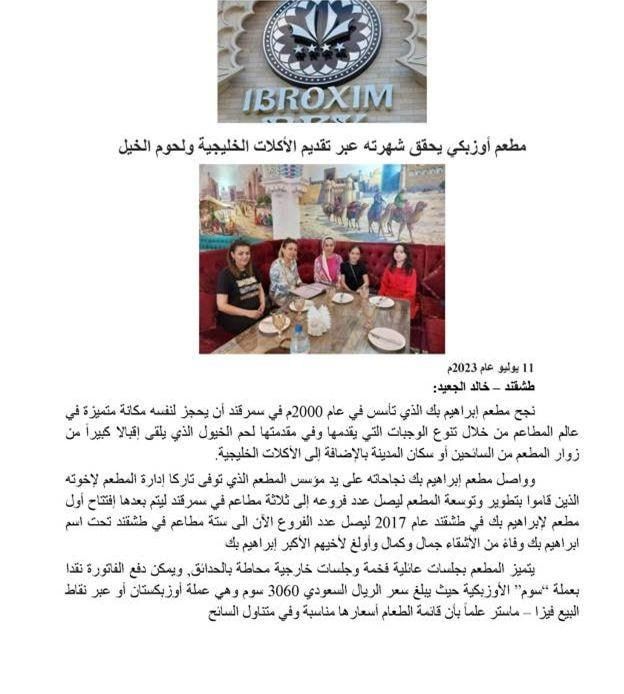 “Arab taomlari va ot go‘shti bilan mashhur bo‘lgan o‘zbek restorani” sarlavhali maqolada saudiyalik gazetxonlar e’tiboriga O‘zbekistonning pazandachilik san’ati to‘g‘risida hikoya qilinadi.