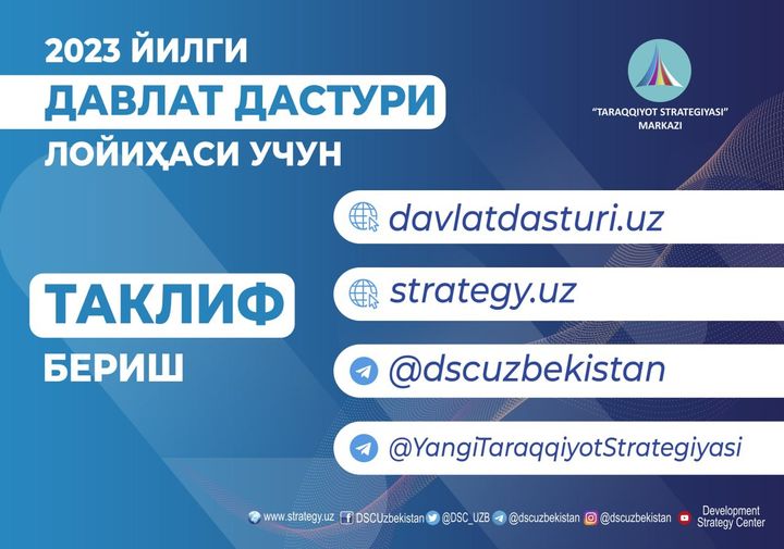 “Siz, aziz xalqimizdan 2022–2026 yillarga mo‘ljallangan Yangi O‘zbekistonning taraqqiyot strategiyasini 2023 yilda amalga oshirishga oid DAVLAT DASTURI loyihasini ishlab chiqishda faol ishtirok etib, takliflaringizni davlatdasturi.uz portali hamda Markazning strategy.uz veb-sayti va @dscuzbekistan telegramm kanali orqali yuborishingizni so‘raydi.