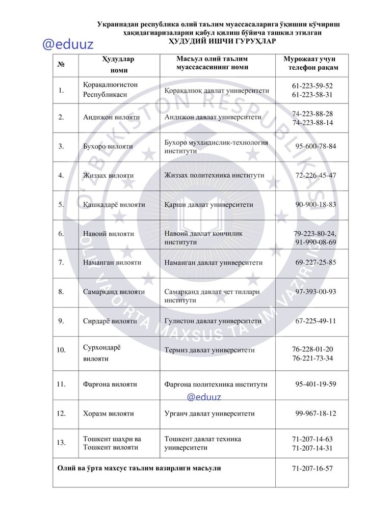 Davlatimiz rahbari raisligida 4 mart kuni o‘tkazilgan videoselektor yig‘ilishida berilgan topshiriqqa binoan Ukrainadan qaytib o‘qishini O‘zbekistonda davom ettirish istagi bo‘lgan talabalarning hujjatlari hududiy ishchi guruhlar tomonidan qabul qilinmoqda.