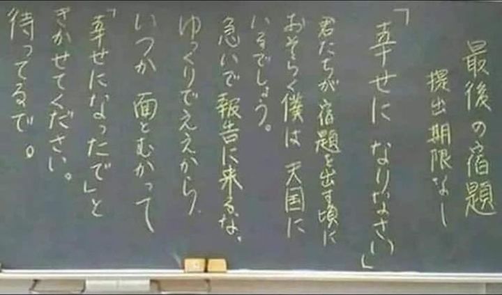 Ijtimoiy tarmoqda bir yapon o‘qituvchisi haqida post ko‘rib qoldim. Aytilishicha, og‘ir kasalga chalingan bir yapon o‘qituvchisi o‘limi yaqinligini sezib so‘nggi marta maktabga kelib doskaga shunday so‘zlarni yozib ketibdi: