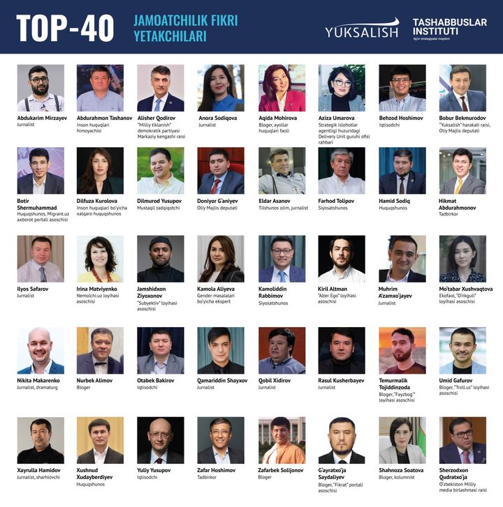 «Yuksalish» harakati Ijtimoiy-iqtisodiy tashabbuslar instituti bilan hamkorlikda hamda ommaviy axborot vositalari vakillari ko‘magida O‘zbekistonning jamoatchilik fikri yetakchilari Top-40 reytingini tuzdi.